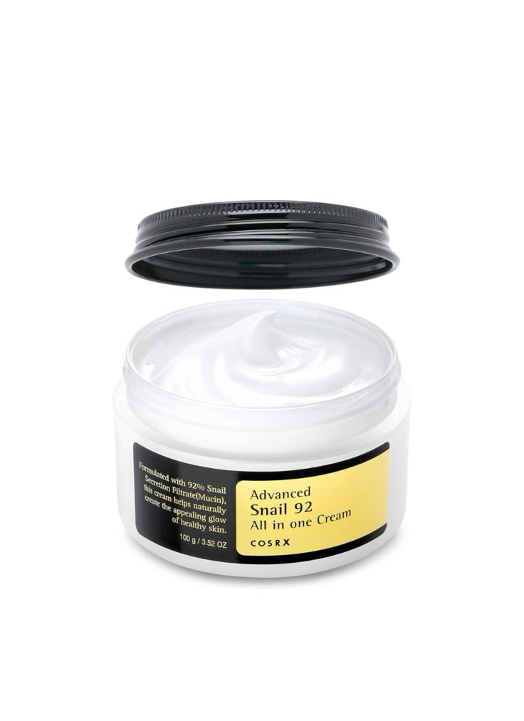 COSRX Advanced Snail 92 All In One Cream is a nourishing, all-in-one moisturizing cream that helps repair, soothe and hydrate the skin in one simple step. Formulated with 92% snail mucin (snail secretion filtrate), this K-beauty favorite supports skin regeneration, improves texture and helps reduce the appearance of acne scars, redness and fine lines.